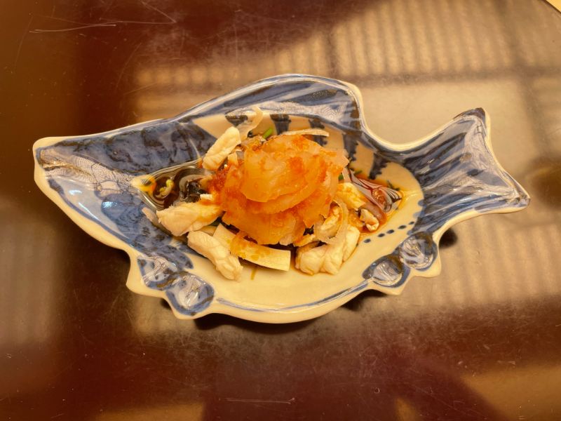 フグの身と皮等を自家製のポン酢で和えてありました。皮の湯引きがあったのですが食感が良かったです。野菜が下の方に入っていたのですが食べるとさっぱりしました。