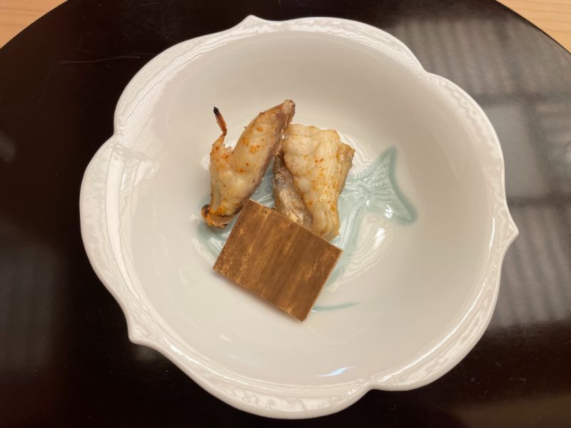 またまたフグの登場です。フグの骨の近くの身を焼いてありました。良かったら手で持って食べてくださいということだったのでワイルドに食べました( ´∀`)!お酒があれば最高だったんだけどなぁ。